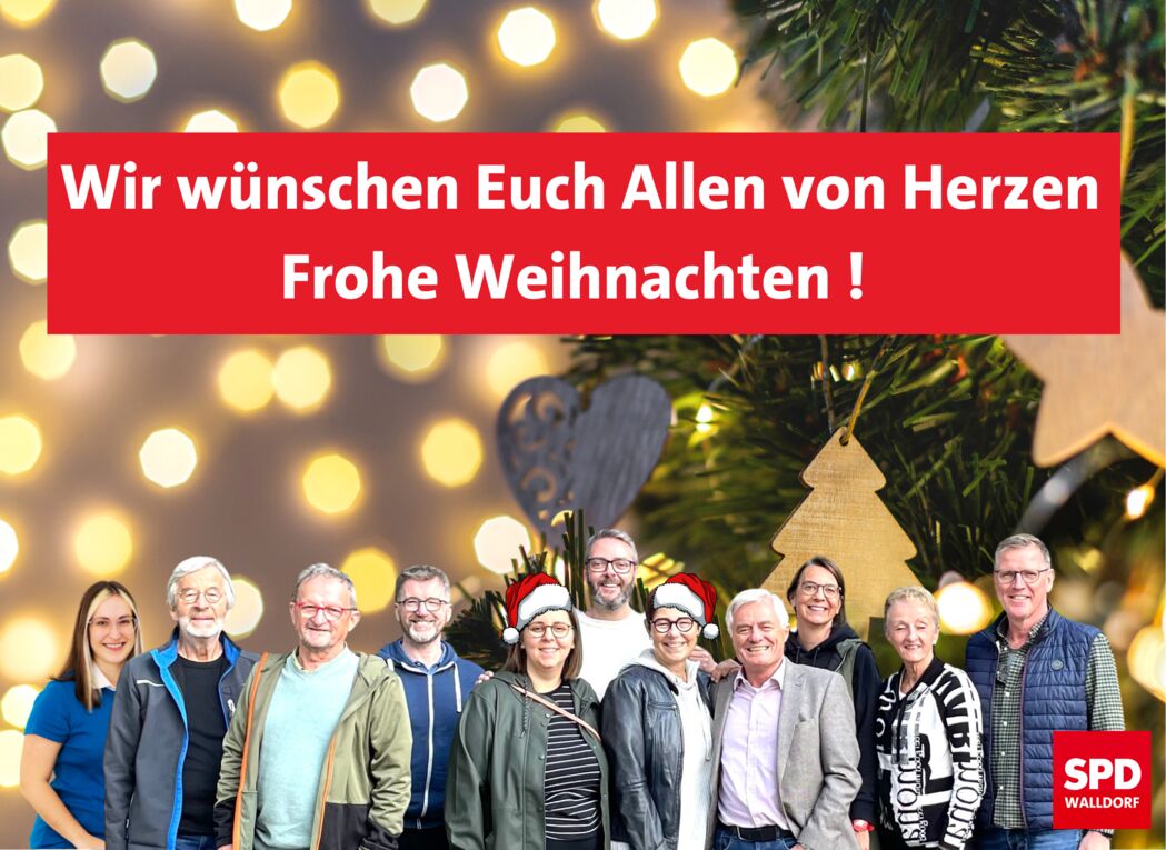 Im Namen des gesamten Vorstands und auch der Gemeinderatsfraktion wünschen wir Ihnen und Euch und Euren und Ihren Lieben ein friedvolles Weihnachtsfest und einen guten Start nach 2025. Schon heute laden wir ganz herzlich zu unserer traditionellen Winterfeier am 11. Januar 2025 ab 15:00 Uhr ins ev. Gemeindehaus in Walldorf ein. Mit Genossinnen und Genossen, ihren Familien und den Freunden der Walldorfer Sozialdemokratie bei Kaffee und Kuchen gesellig beisammensitzen und sich austauschen: genau so möchten wir gerne mit Dir und mit Ihnen gemeinsam in das neue Jahr starten.